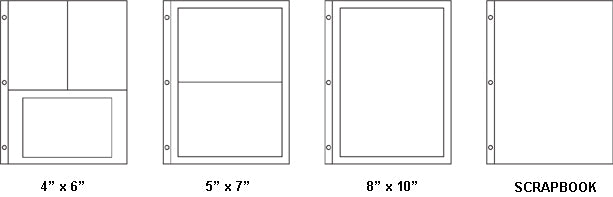 Standard size ring binder contains 8.5'' x 11'' photo pages. Album contains 15 sheets for 4'' x 6'' photos, 5 sheets for 5'' x7'' photos, 5 sheets for 8'' x10'' photos and 5 scrapbook pages with separation sheets.